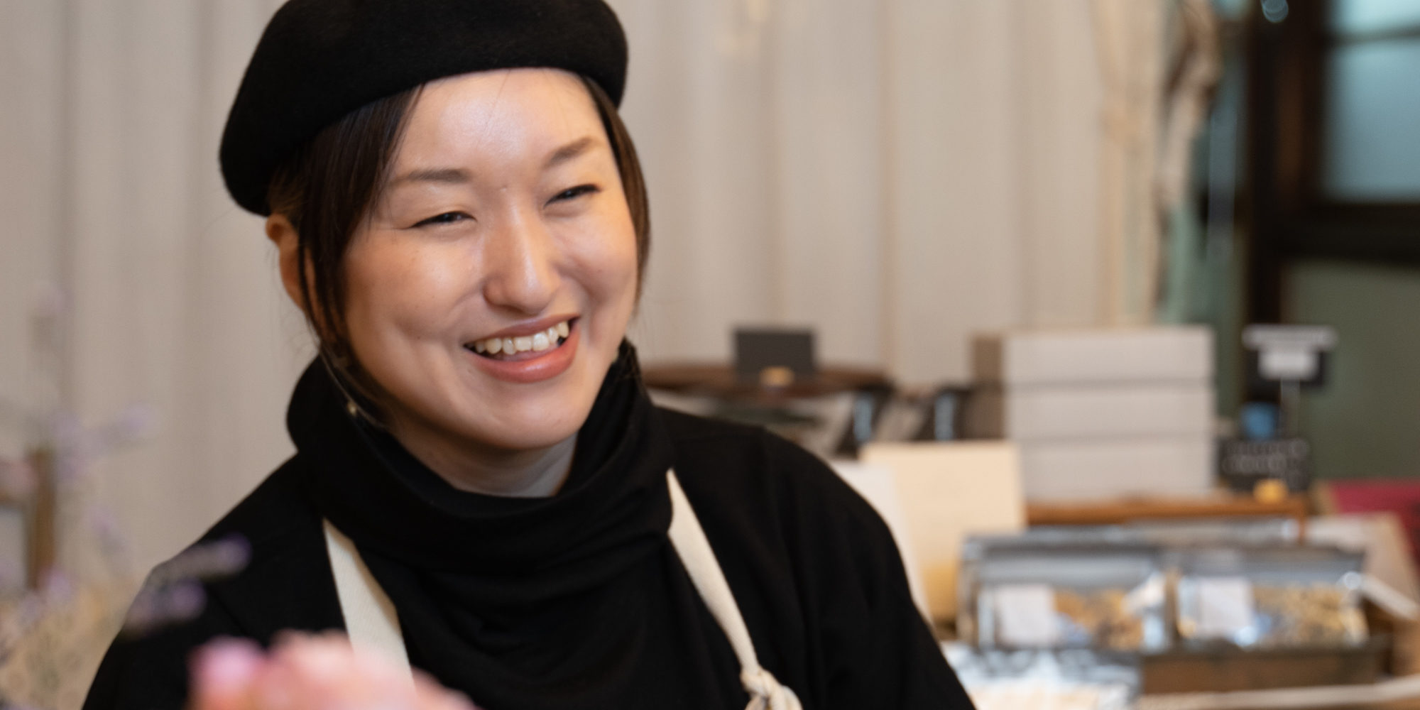 「ピアスやドライフラワーやリースなどを手作りしてお店に並べています。元々DIYが好きで店内の出来るところは全部自分で行いました。オーダーピアスの制作途中にパーツが無くなったり、方法が分からない場合には工具を使って自己流で仕上げることもあります。最近は独学でウィービング(織物)も始めました。」