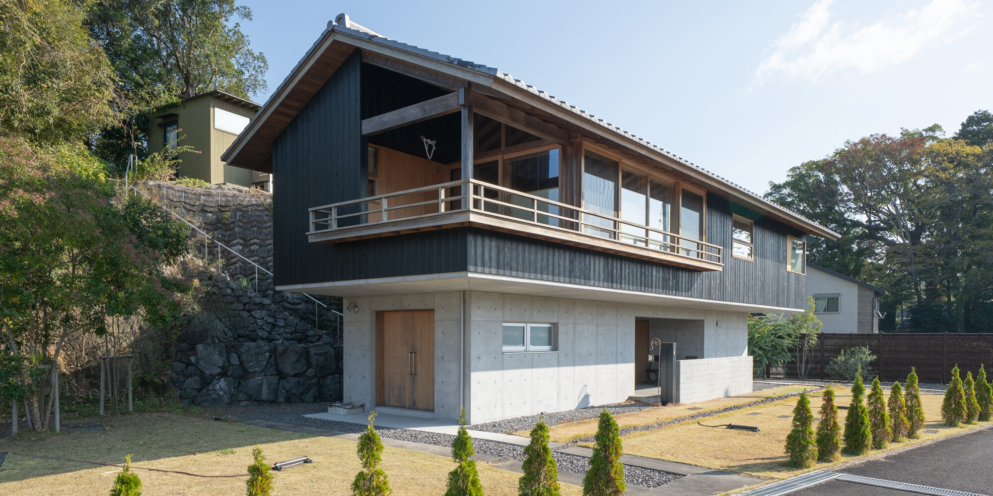 久しぶりに現地を訪れる機会があり、あの日から積み重なった時間を確かめるように建物を眺めてみると、焼杉の外壁は色合いがやわらかく変化し、より周辺の自然に溶け込む落ち着いた表情へと育っていました。