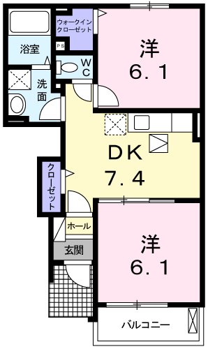 | 間取り | 2DK(DK7.4畳・洋室6.1畳・洋室6.1畳) |