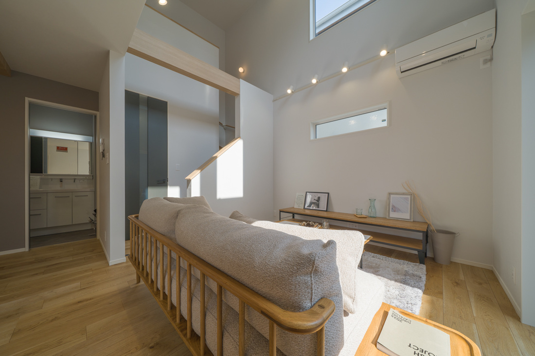 吹抜が生み出す縦の広がりが、リビングに自然な開放感とゆとりをもたらしています。