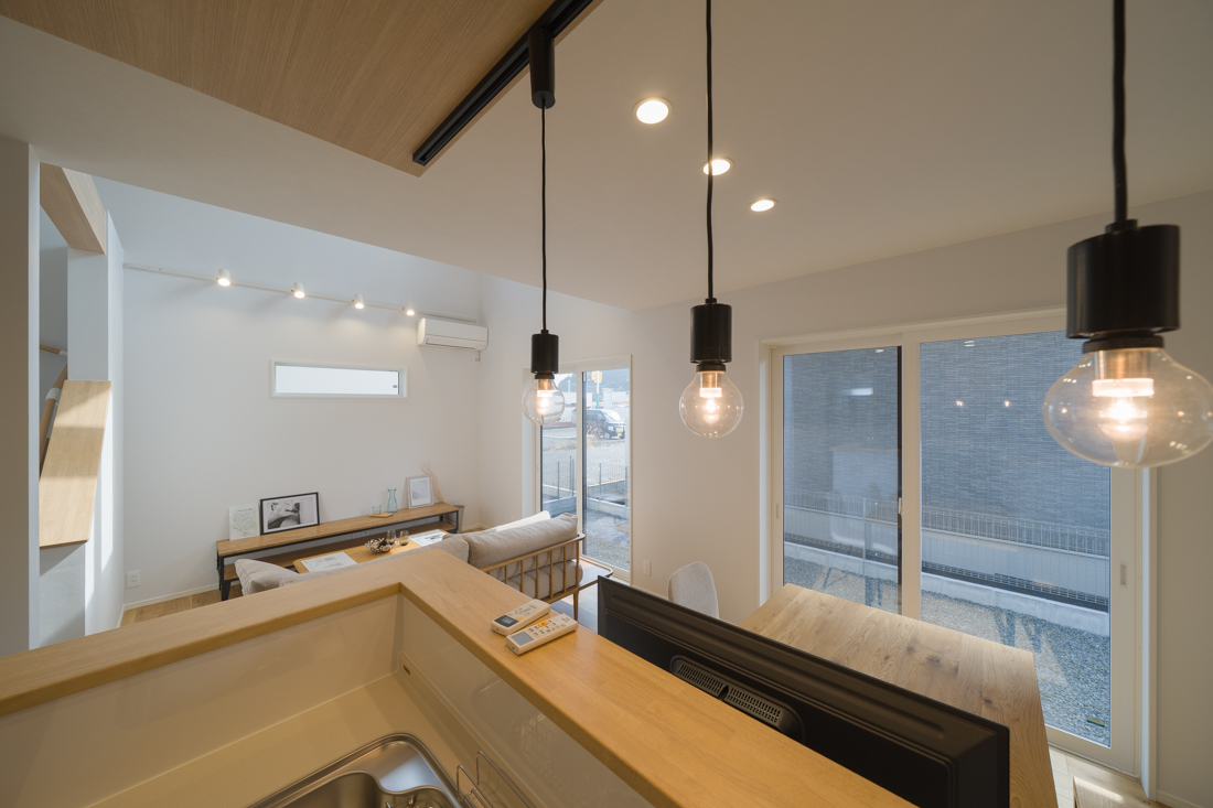 高さのあるリビングだからこそ、その柔らかな灯りが空間全体に表情を与え、夜の時間帯も落ち着いた雰囲気で過ごせそうです。