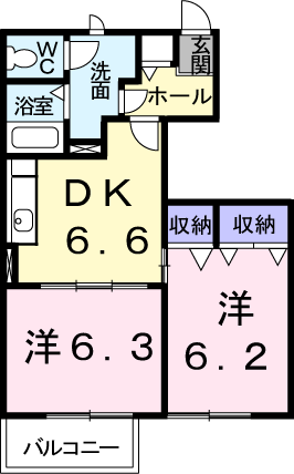 | 間取り | 2DK(DK6.6・洋6.3・洋6.2) |